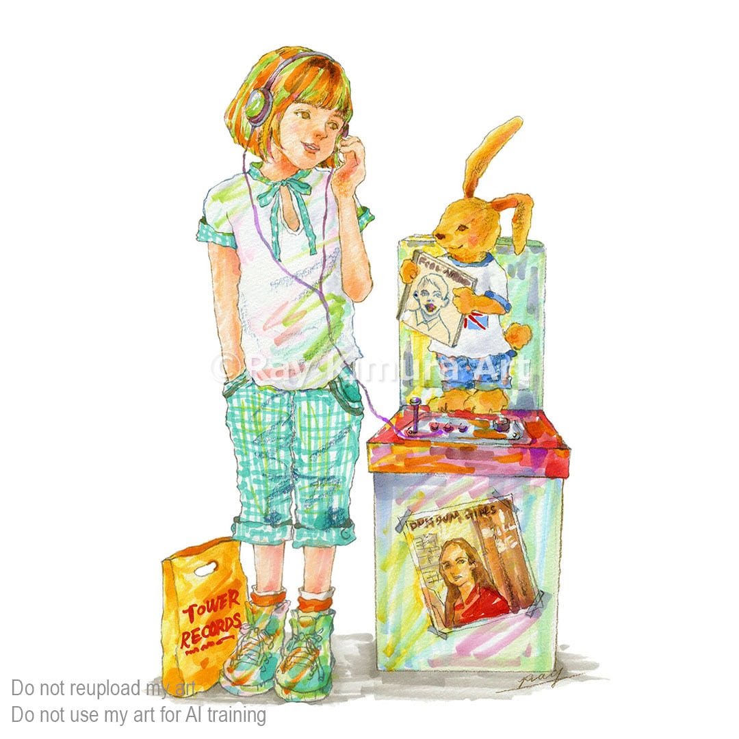 新しい音楽を探しにレコード店でいつも視聴していた青春期の想い出を、女の子と相棒のバニーの姿に再現。