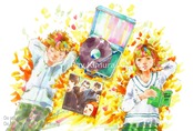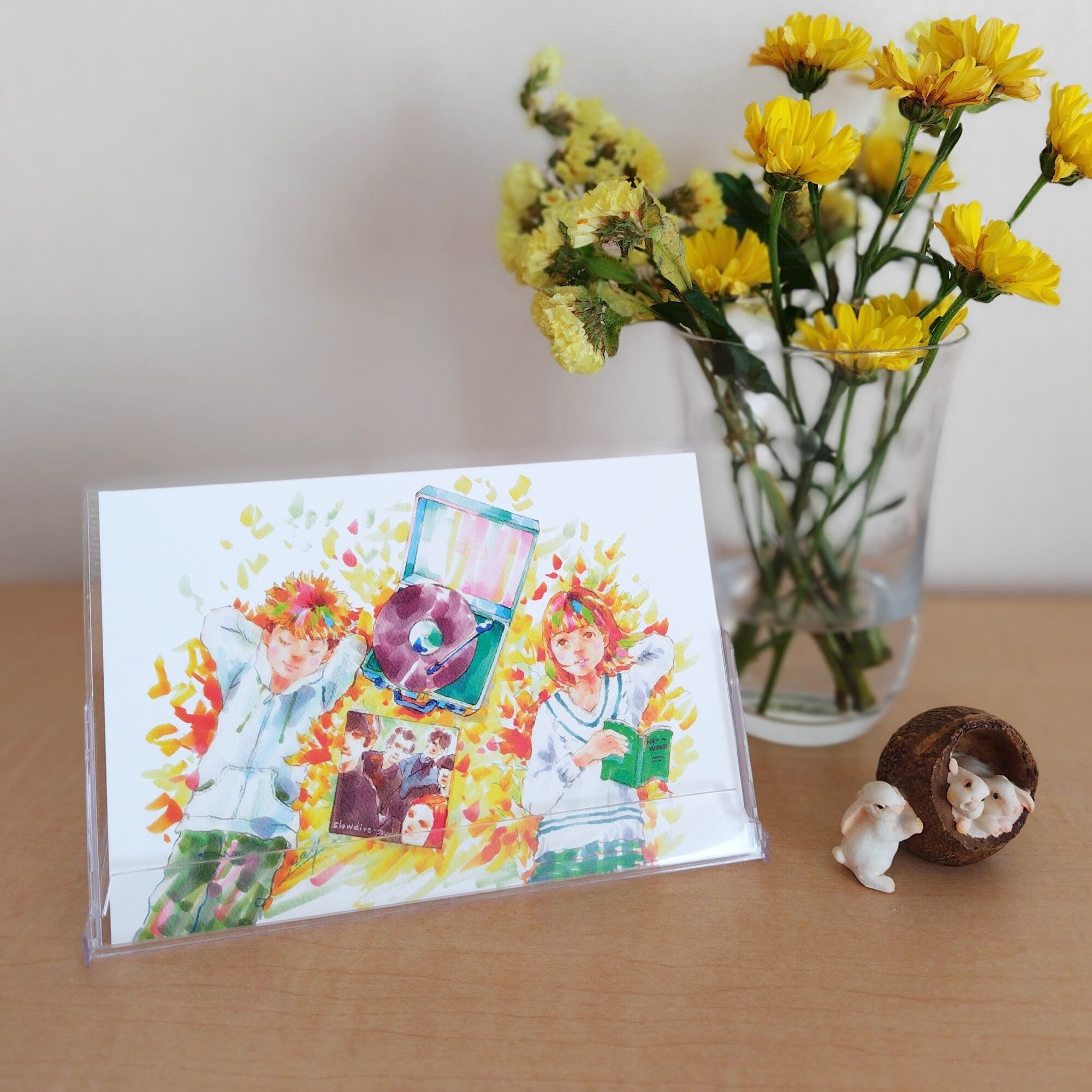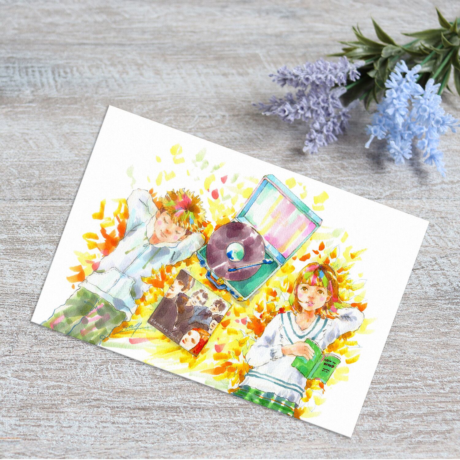 ポストカード 紅葉の中、レコードを聴くふたり