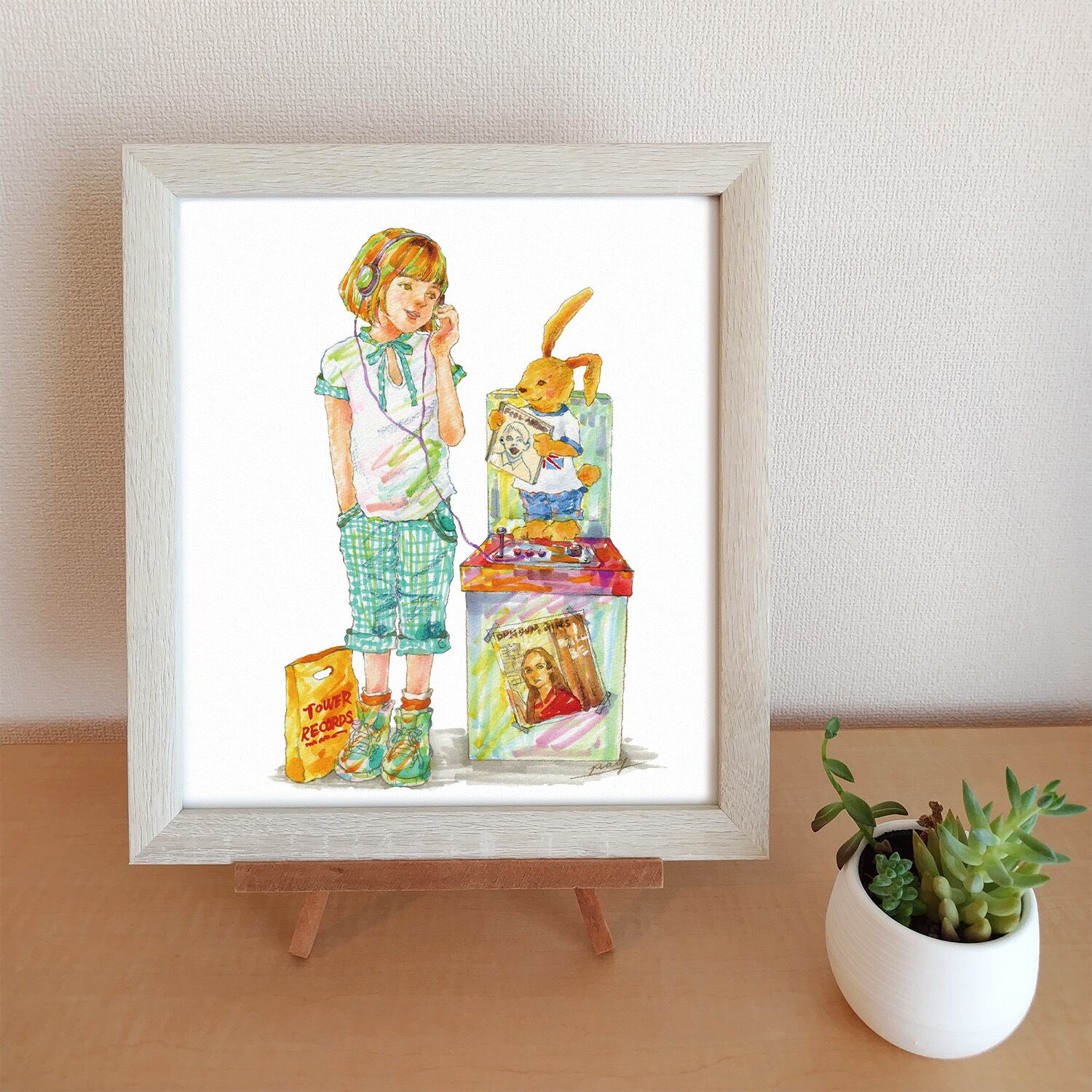 アートプリント レコード店で視聴するヘッドホンガールとバニー