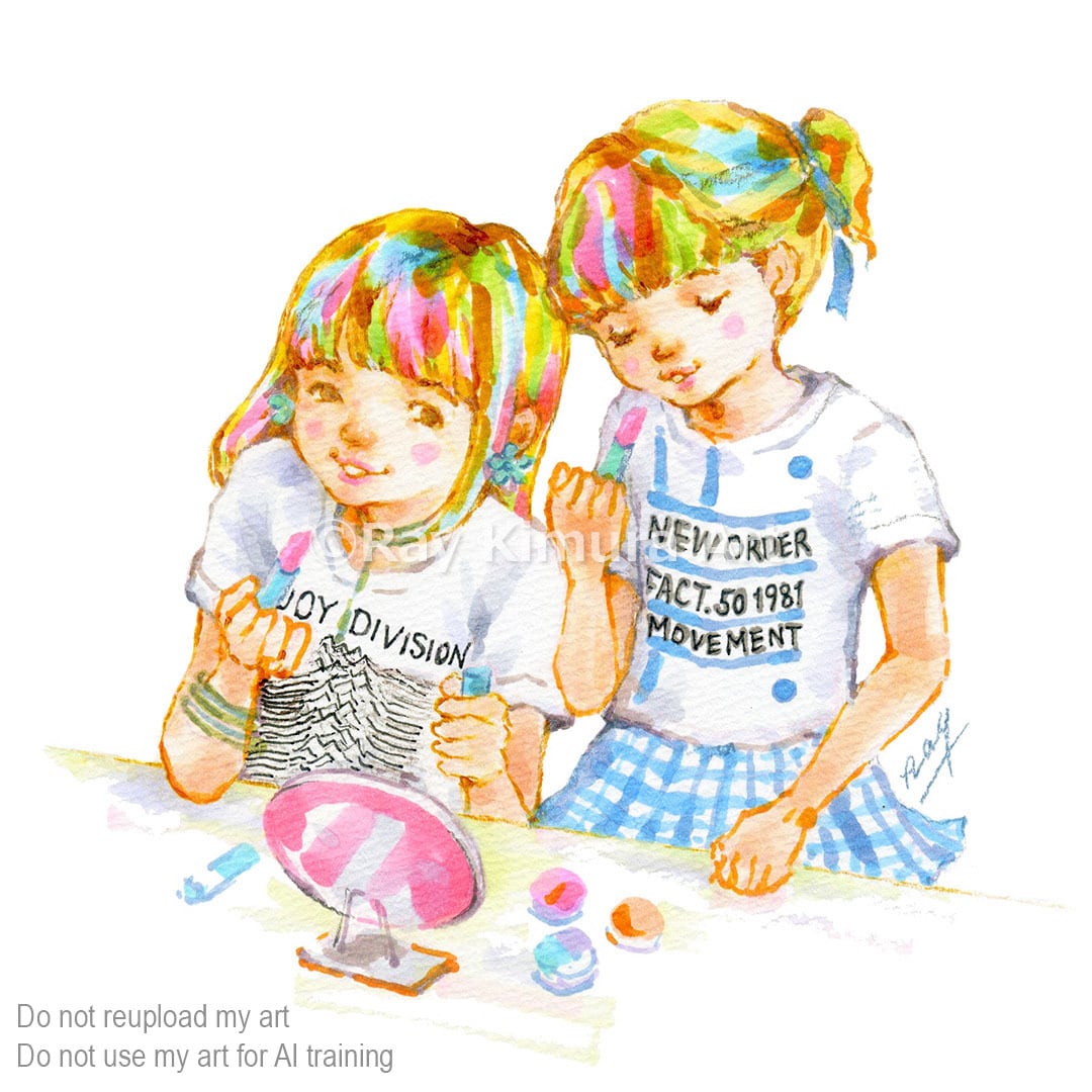 はじめてのメイクを楽しむ、なかよし姉妹。