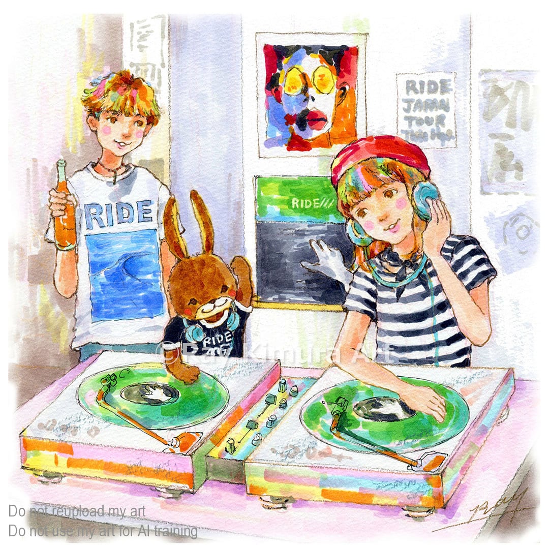 女の子と相棒のバニーが一緒にDJ。