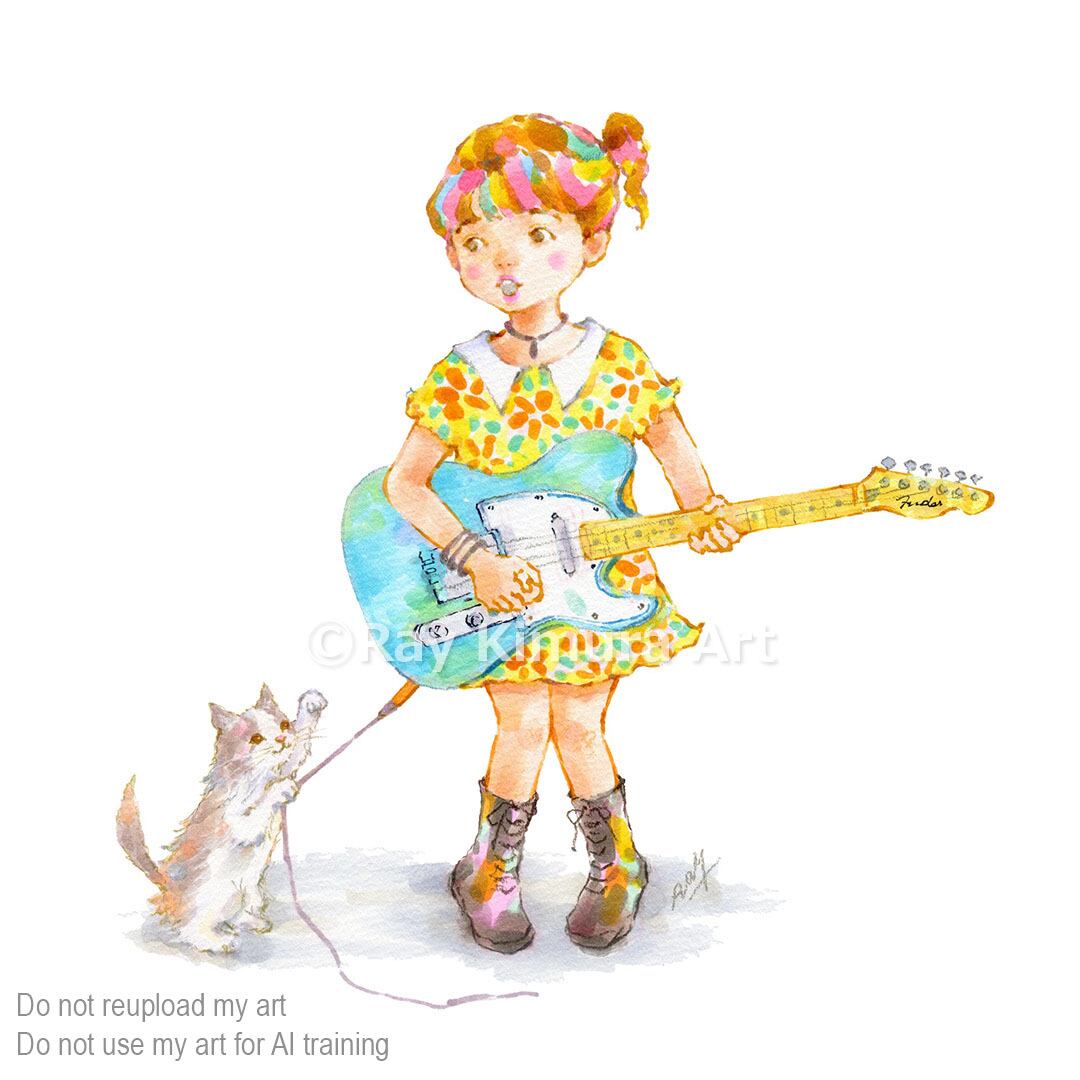テレキャスギターをがんばって弾くおてんばな女の子と、邪魔ばかりするいたずら子猫。